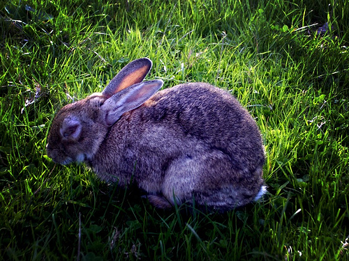 Habitat: A wide variety, ranging from farmland to moorlands, woodlands and sand dunes.They generally have greyish-brown fur with orange at nape of neck (black rabbits are fairly common). Long ears (up to 7cm) but shorter than hares' and no black tips. Short tail, black on top and white underneath. The male (buck) 48cm (19in) long. Female (doe) smaller with narrower head.There Life-span is about 9 years. In the wild most rabbits live less than one year.They eat mainly grasses, clovers and other green plants; also bark of trees.